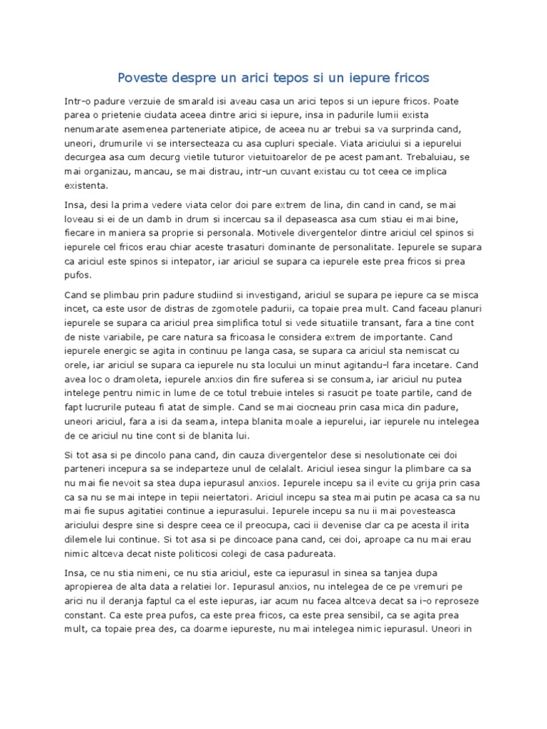 Iepurele si ariciul poveste. Intr o zi frumoasa de toamna se intalni iepurele si ariciul. Au plecat împreuna sa caute loc pentru o casuța pe drum s au întalnit cu un șarpe acesta s a repezit la iepuraș zicand. Iepurele ajunse la capatul brazdei dar femeia arici ridica capul din brazda si spuse. Citeste basmul iepurele și ariciul în care este vorba despre un iepure care intr o zi de toamna se intalneste cu un arici.