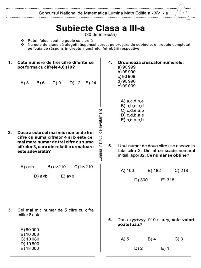 In tabelul de mai jos am incercat sa adun intr un singur loc subiectele si raspunsurile din anii. Luminamath2018 lumina math 2018 lumina math inscriere lumina math concurs matematica 2018 concursul este de tip test grila alcatuit din 30 de probleme grila pentru clasele ii iv si 40 de probleme grila pentru clasele v viii fiecare intrebare avand 5 variante de raspuns dintre care elevii aleg o singura varianta. Puteti consulta subiectele anilor anteriori in arhiva concursului lumina math create pe site ul nostru www luminamath ro. Concursul de matematica luminamath se adreseaza elevilor claselor a ii a a iii a si pana la clasa a viii a.